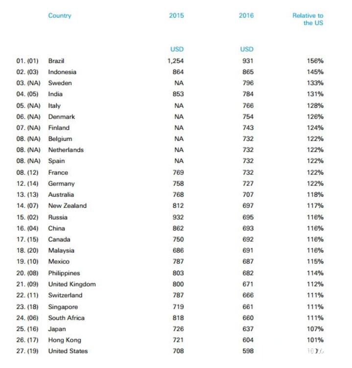 數(shù)據(jù)顯示,相對于iPhone賣的最便宜的美國,大多數(shù)國家iPhone的溢價(jià)都在10%-20%左右,但有些國家iPhone卻貴得離譜。舉例來說,巴西成了iPhone賣的最貴的國家,其售價(jià)達(dá)到了930美元,而同款機(jī)型在美國600美元就能買到。