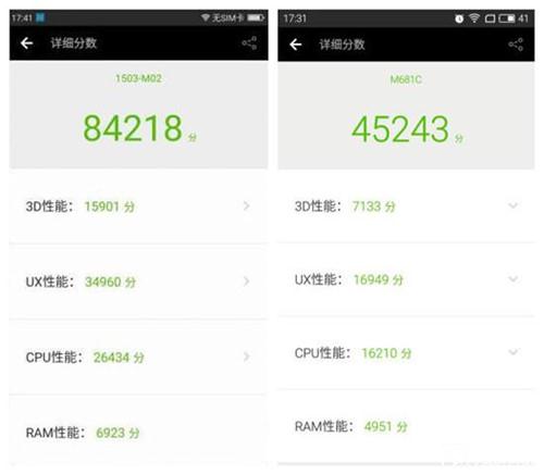 通過安兔兔進(jìn)行的簡(jiǎn)單跑分測(cè)試,360手機(jī)N4的跑分成績(jī)達(dá)到了84757分,而魅藍(lán)Note3的跑分略微遜色了些,為43629分。一個(gè)超過8萬,一個(gè)4萬有余,相差四萬多,尤其是在CPU性能以及UX性能的差距更是明顯。不過,如此之大的跑分差距,也再次彰顯了聯(lián)發(fā)科最新旗艦級(jí)芯片Helio X20十核處理器的強(qiáng)悍實(shí)力。單從性能上來講,360手機(jī)N4絕對(duì)是更好的選擇。