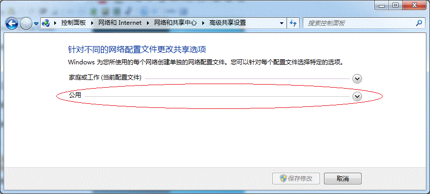 注意:如果是公共網絡,具體設置和上面的情況類似,但相應地應該設置【公共】下面的選項,而不是【家庭或工作】下面的,如下圖: