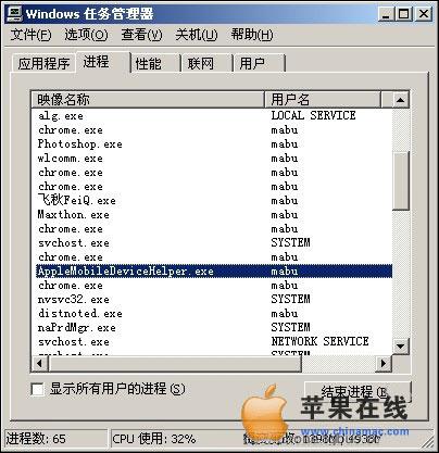 替換前注意備份iTunesMobileDevice.dll文件。如果文件無法替換,說明那是iTunes的后臺服務還在運行,用任務管理器關閉ituneshelper.exe和下圖中的進程就可解決問題。