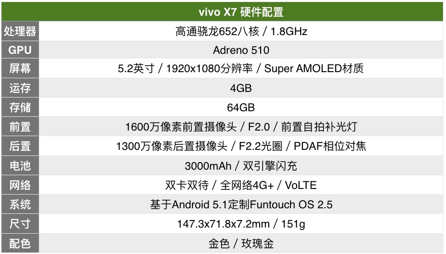 硬件配置方面,vivoX7采用一塊5.2英寸1080P分辨率SuperAMOLED顯示屏,內(nèi)部配備高通驍龍652八核64位處理器,輔以4GBRAM+64GBROM。相機(jī)采用前置1600萬像素+后置1300萬像素組合(vivoX7Plus為前后雙1600萬像素?cái)z像頭),其中前置攝像頭配有Moonlight自拍補(bǔ)光燈、內(nèi)部配備3000mAh電池,支持vivo獨(dú)家雙引擎閃充技術(shù)以及雙卡雙待全網(wǎng)通4G+/VoLTE網(wǎng)絡(luò)制式。