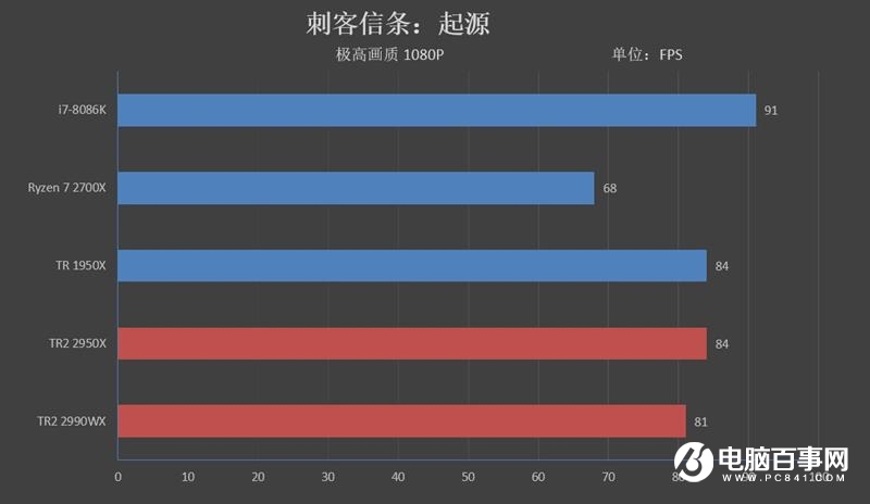 TR4平臺(tái)表現(xiàn)最好的是1950X核2950X,2款CPU都能達(dá)到84幀。