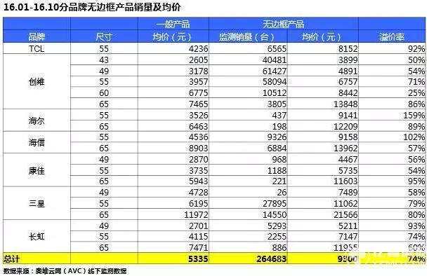 隨著這兩個不同點,面板工藝也需要做出相應調整,一個是增加邊角的處理工藝來磨出兩個圓角,一個是增加側面的涂布工藝涂封框膠來防止漏光。增加了工藝、工時,影響了成本和良率,所以無邊框產品相對一般產品價格要高出不少,不過隨著面板廠的工藝嫻熟良率提高,這種價格差已經控制在10美金左右(55寸為例)。